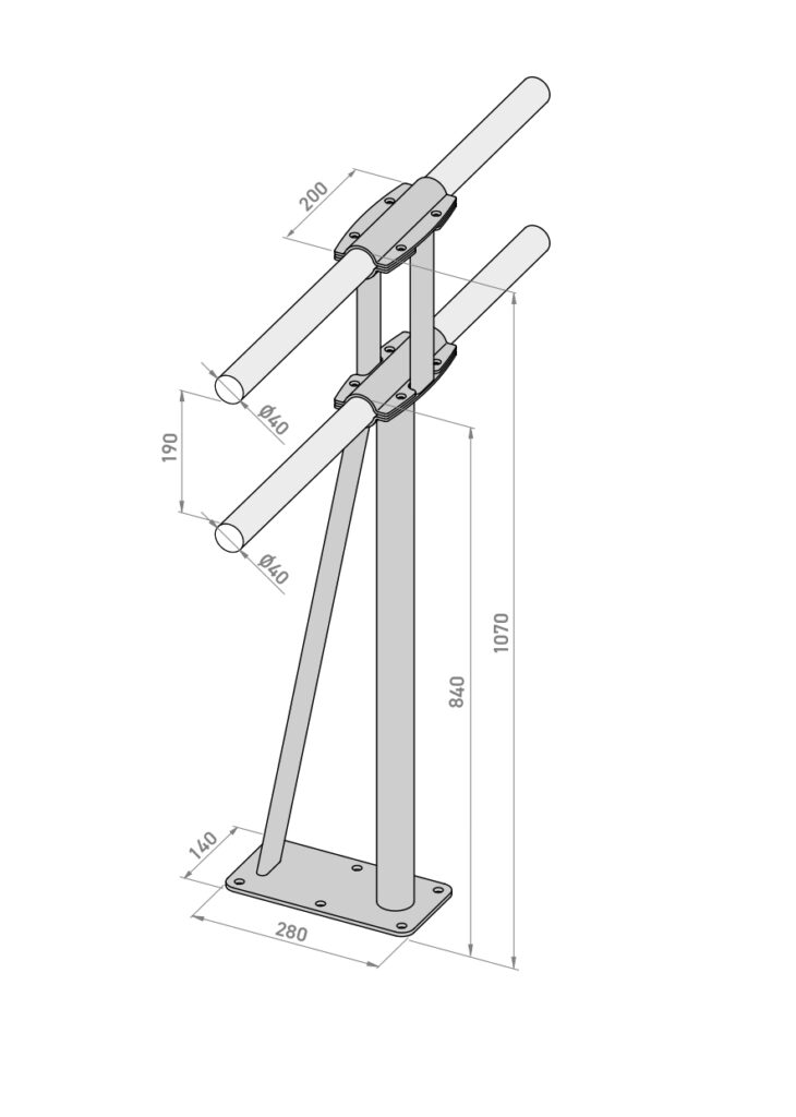 Los soportes de suelo Pina-Fix Fitness, exclusivos de Dinamica Ballet, para dos barras de madera situadas a dos alturas se han desarrollado para disciplinas de barre fitness, entrenamiento funcional y actividades que requieren gran exigencia estructural. Su diseño único reforzado, con base ampliada, seis anclajes y doble columna, ofrece una estabilidad superior para entrenamientos dinámicos, apoyos prolongados y ejercicios de alta carga.